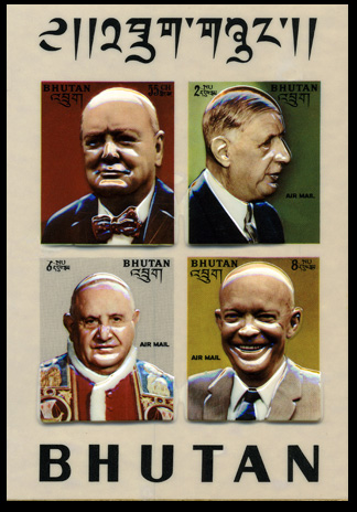 A Bas-Relief postage stamp, printed in 1971, was a world’s first for the Government of Bhutan. The process originated in Italy and took five years to develop. The stamps have a sculptural effect, giving the subject matter depth and dimension. These are the world’s first 100% plastic stamps. They are single-trimmed and printed by a four-color lithography method. The individual stamps were placed in a hand-engraved stainless steel pressure heat mold and pressed into small reproductions of sculptures (Issue: February 27, 1971) and of famous men of the world (Issue: 1972). |