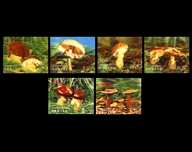 These stamps were produced by the famous three-dimensional printing process, which employs specially designed cameras and photographic skills, together with microscopic registrations, and a bonded plastic overlay to give unbelievable depth to the picture. The Bhutan Government felt that these different types of mushrooms, many indigenous to Bhutan and the Himalayas, were exceptionally beautiful.