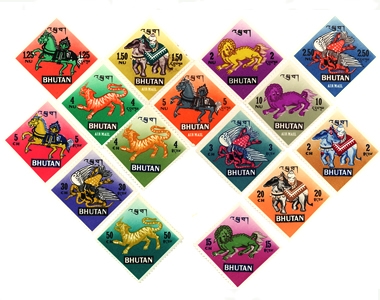 In the land of eternal thought, Buddhism permeates Bhutan's culture. Bhutan’s religious thought and rich mythology are embodied in thousands of wall paintings, scrolls, images, all across the land. To penetrate to the heart of Bhutanese mythology, one has to begin with the symbolism depicted by the Garuda, the Snow-Lion, the Tiger, the Elephant and the Horse. The Post & Telegraph Department of His Majesty’s Government of Bhutan have pleasure in issuing a set of fifteen stamps depicting these legendary animals. |