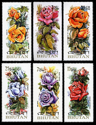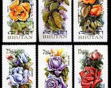 The Government of Bhutan presented another first in stamp production in 1973: an issue depicting a variety of roses, each with an authentic scent. The printing process took more than a year to develop and uses lasting ink which incorporates the actual aroma of roses. The world’s first scented stamp issue consists of six denominations: four regular postage and two airmail. Famous roses were illustrated: the Iceberg, the Pink Parfait, the Rosyln, The Blue Moon, the Marchioness of Urguijo and the Wendy Cusson. |