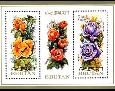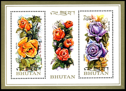 The authentic aroma of Bhutan's first scented stamps required a separate printing plate with perfumed ink. Two airmail stamps of roses, Roslyn-6Nu and Blue Moon-7Nu, are depicted on this Souvenir Sheet. This Souvenir Sheet was printed in a perforated and imperforated version and was issued January 30, 1973. |